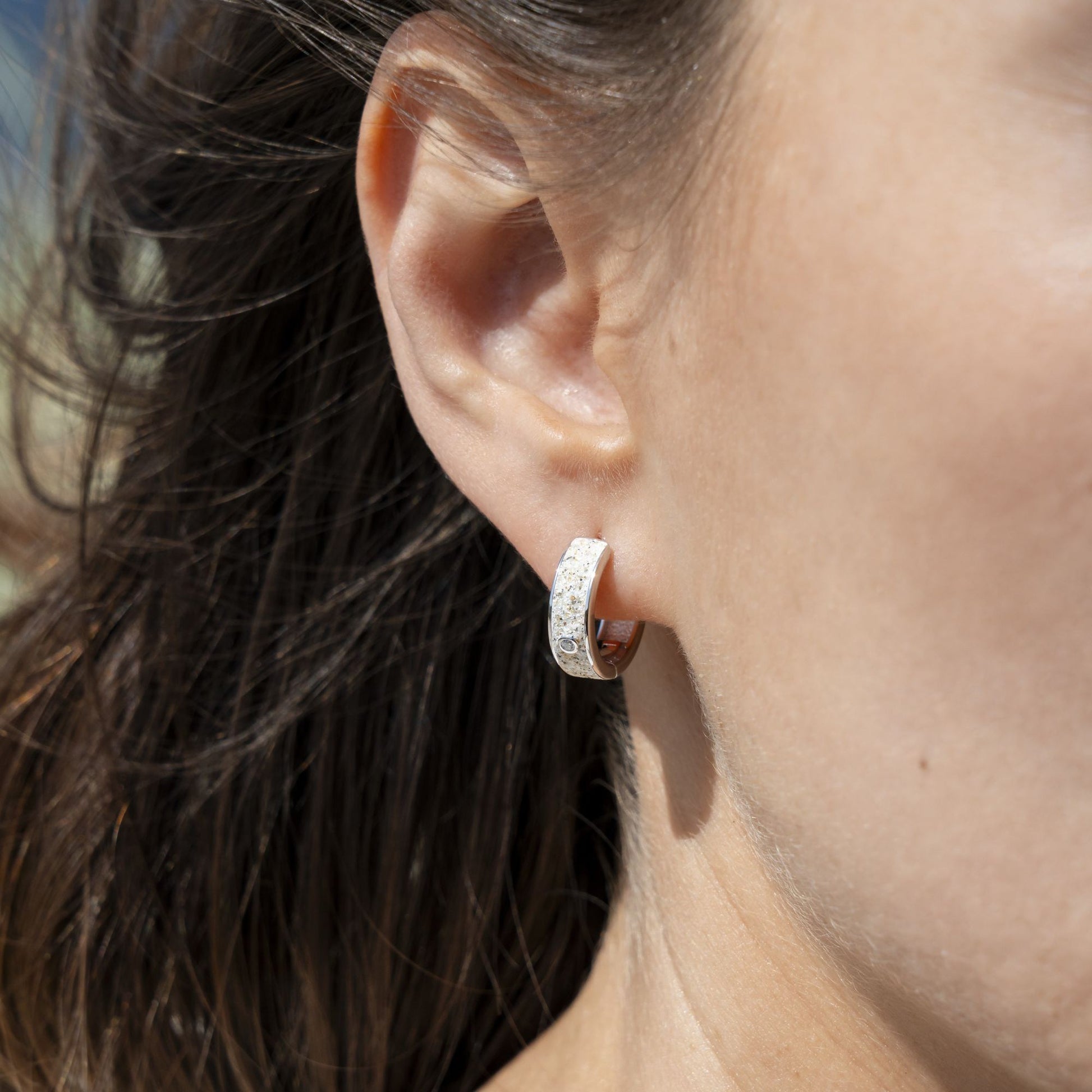 Klappcreole "Nordlicht" mit einem kleinen in Strandsand gebetteten Zirkoniastein, gefaßt in rhodiniertem 925er Sterlingsilber.