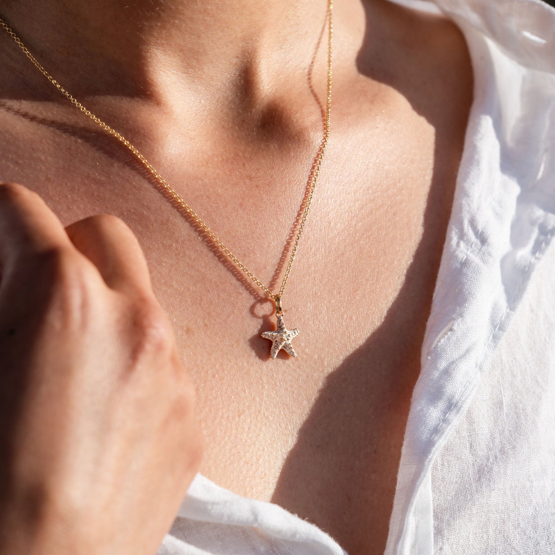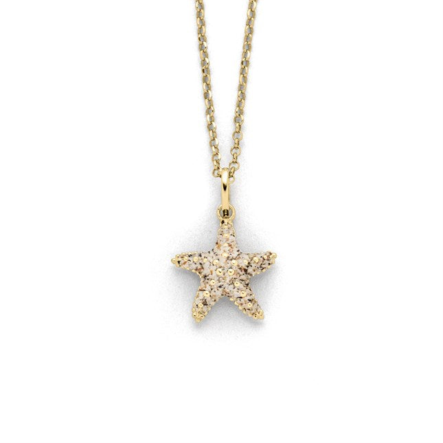 Echte Sehnsucht: Feine Erbskette vergoldet mit einem Anhänger in Form eines Seesterns, gefüllt mit Strandsand, alles aus poliertem und vergoldetem 925er Sterling-Silber, ca. 45 cm lang.