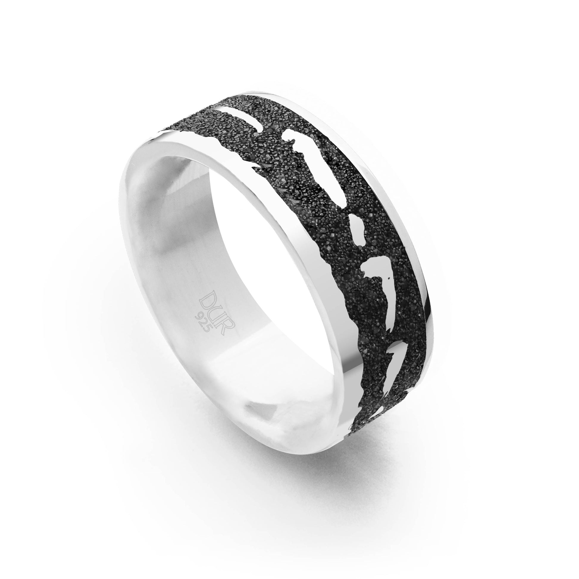 Nachtring "Nordsee" 7 mm mit den Silhouetten der Nordseeinseln:Borkum, Juist, Norderney, Baltrum, Langeoog, Spiekeroog, Wangerooge, eingebettet in Lavasand und gefasst in rhodiniertem 925er Sterling-Silber.