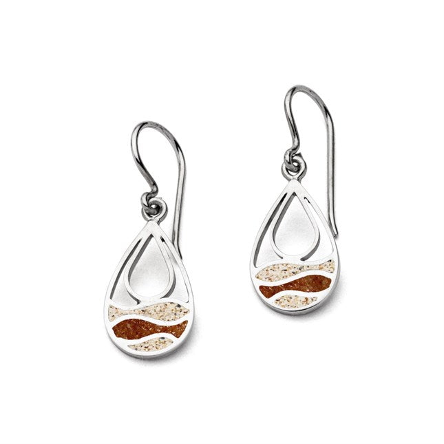 Ohrring "Strandwellen", kleiner Ohrring in Tropfenform, die obere und untere Welle ist mit Strandsand und die mittlere Welle mit Bernsteinsand gefüllt, gefaßt in rhodiniertem 925er Sterlingsilber.