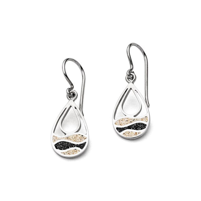 Ohrring "Strandwellen", kleiner Ohrring in Tropfenform, die obere und untere Welle ist mit Strandsand und die mittlere Welle mit Lavasand gefüllt, gefaßt in rhodiniertem 925er Sterlingsilber.